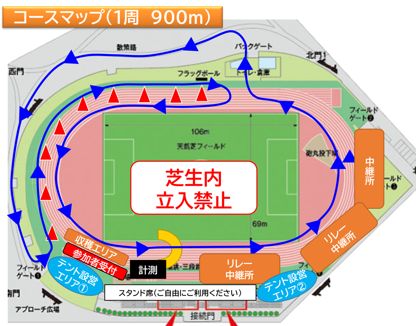 | 給水 | あり コース外に1か所設置いたします。 水以外の飲み物はトラック外にてお願いいたします。 |