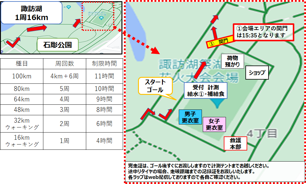 | 受付 | 諏訪湖湖畔公園(石彫公園) ウルトラ100km 5:20~ ウルトラ80km/64km 6:30~ その他種目 7:30~ (受付は各種目スタートの15分前まで) |